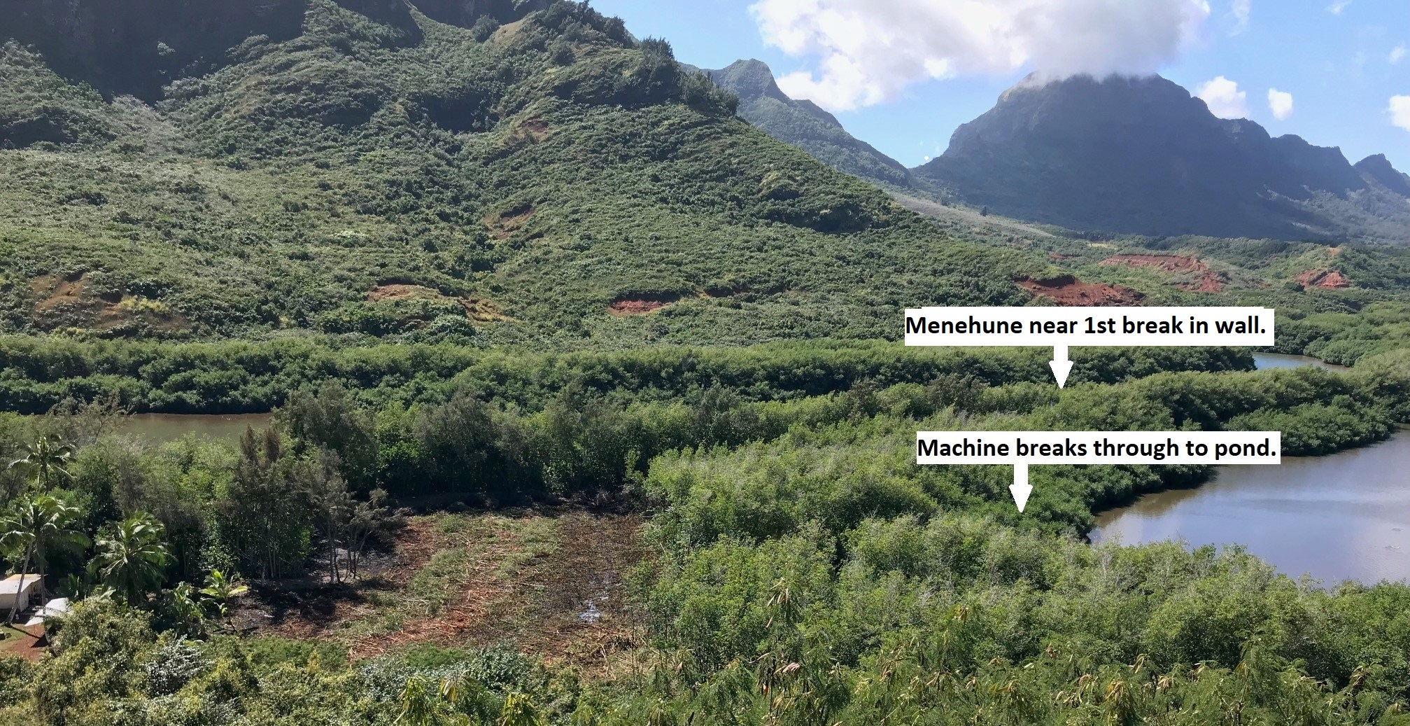 Until last year, both the wall and much of the pond were densely overgrown with invasive red mangrove trees. Mangrove was introduced to the islands for erosion control nearly a century ago, but has now displaced hundreds of acres of native coastal lands. There are now community efforts to clear mangrove from coastal areas on several Hawaiian islands.